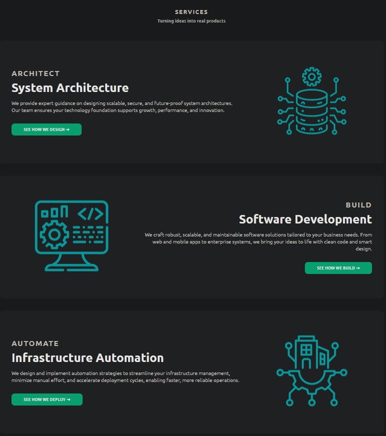We’re a company that offers comprehensive technology services focusing on scalable and secure system architecture, custom software development, and automation solutions. We emphasize building robust, future-proof systems tailored to business needs, supporting growth and innovation across web, mobile, and enterprise applications. Our approach includes clean code, smart design, and streamlined infrastructure management to improve reliability and efficiency.