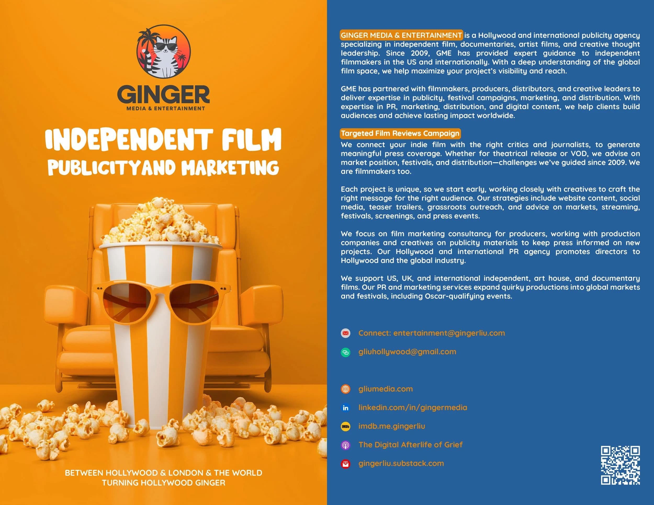 Ginger Media & Entertainment is a Hollywood and international indie film publicity and marketing agency specializing in US and international indie film, documentary, arthouse, genre/horror, women in film, and Hollywood tech.